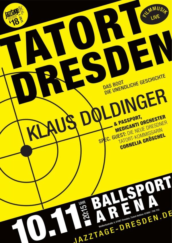 Ausnahmsweise gibt es bereits am Samstag einen Tatort. 20.15 Uhr wird die BallsportARENA Schauplatz eines unheimlich tollen Konzerts. Klaus Doldinger und seine Band Passport sorgen für spannende Unterhaltung und »medicanti« sorgt in mehreren Titeln, wie u.a. den Filmmusiken zu »Das Boot« und »Die Unendliche Geschichte« sowie natürlich in der Tatort-Titelmusik, für den passenden sinfonischen Rahmen.